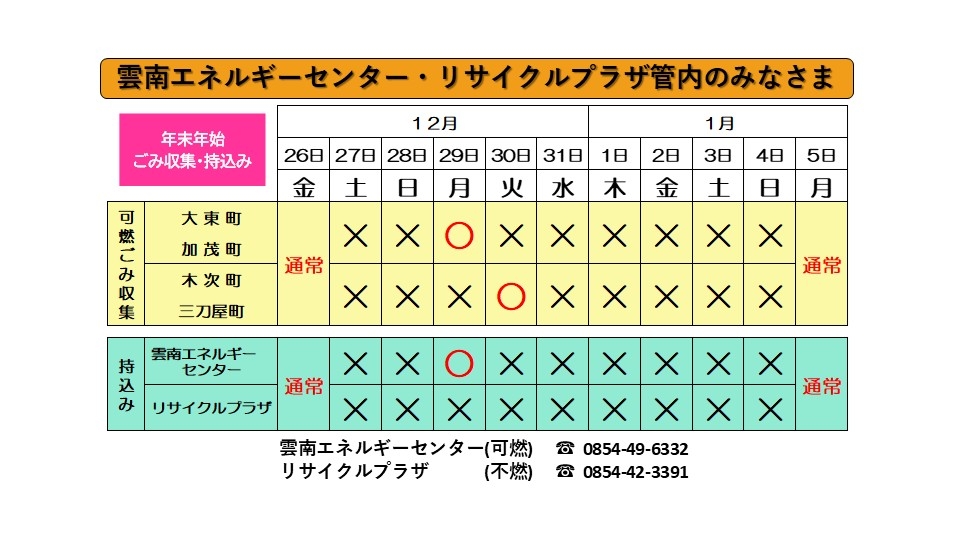 ≪年末年始≫ごみ収集およびごみの持込みについて(大東町・加茂町・木次町・三刀屋町)
